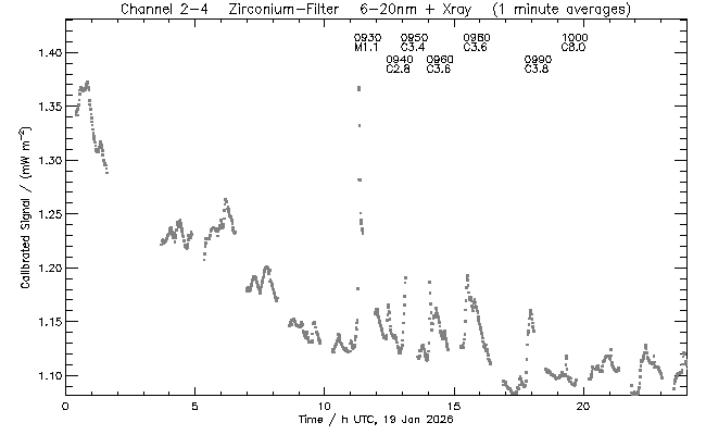 event begin max end class region ----- ----- ----- ----- ----- ------ 0930 11:09 11:19 11:22 M1.1 4345 0940 12:23 12:27 12:30 C2.8 4345 0950 12:57 13:07 13:12 C3.4 4345 0960 13:57 14:04 14:07 C3.6 4345 0980 15:22 15:31 15:42 C3.6 4345 0990 17:44 17:58 18:19 C3.8 4345 1000 19:09 19:21 19:45 C8.0 4342
