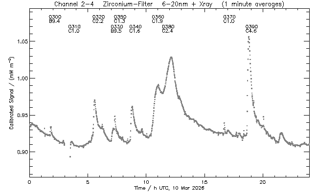 event begin max end class region ----- ----- ----- ----- ----- ------ 0300 01:40 01:47 01:50 B9.4 4387 0310 03:20 03:27 03:32 C1.0 4387 0320 05:24 05:33 05:41 C2.2 4389 0330 06:58 07:09 07:15 B9.5 4378 0350 07:15 07:18 07:20 C1.3 4381 0340 08:34 08:46 08:56 C1.6 4389 0360 10:30 10:50 11:22 C1.9 4389 0380 11:22 12:04 12:20 C2.4 4389 0370 16:38 16:41 16:44 C1.0 4381 0390 18:32 18:45 18:55 C4.6 4381